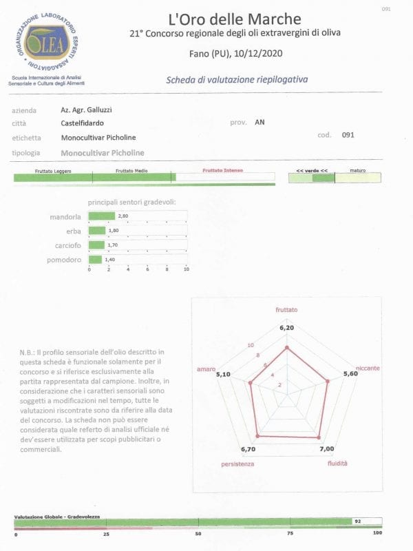 2021 – 1° premio al Concorso Oro delle Marche edizione 2021. Fruttato intenso.